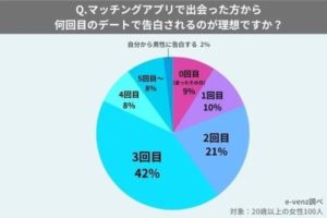 42%の女性が「3回目」が理想と回答。最初のデートはお試し感覚で、2回目で少しお互いのことを知っていき、3回目で一緒に過ごすのが楽しくなってくることが多いようです。つまり、3回目のデートの約束ができれば、お付き合いできる可能性はかなり高いということ。