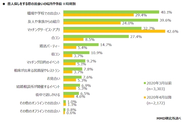 そこで、あると回答した5,475人に「恋人探しをする際の出会いの場所や手段」を聞くと、2020年3月以前は「職場や学校での出会い」40.1%、「友人や家族からの紹介」39.6%がトップ2だったが、2020年4月以降は「マッチングサービス・アプリ」42.6%、「職場や学校での出会い」29.4%と大きく変化していた。