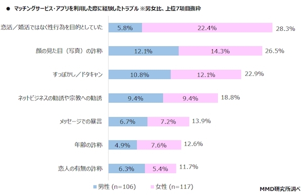 一方、利用経験者500人に「マッチングサービス・アプリでトラブルを経験したことがあるか」を聞くと、「ある」44.6%、「ない」55.4%で半数近くがトラブルに遭遇していた。具体的な内容では「恋活/婚活ではなく性行為を目的としていた」28.3%、「顔の見た目(写真)の詐称」26.5%、「すっぽかし/ドタキャン」22.9%が上位となっている。自由意見では、「ネットビジネスの勧誘や宗教への勧誘だった」「メールアドレスやLINE IDを回収する業者だった」「マルチ商法に勧誘された」といった声もあがっている。