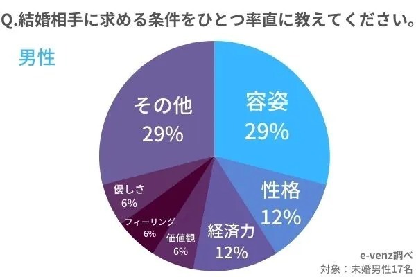 男性は結婚相手に容姿を求める人が多い一方、女性は容姿より性格の相性や経済力を重視する方が多いことが分かります。そんななか「求める条件は特にない」という意見もあることから、「条件に関わらず好きになった人と結婚したい」と考える女性も多いようですね。