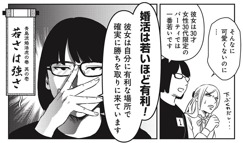 同作はこのように、婚活にもがく赤木を軸に展開される漫画ですが、同僚の青島による身もフタもないツッコミもまた魅力の1つ。職場では赤木に「彼氏いたことなさそう」と見下されていますが、たまたま同席していたこのパーティーでは、「赤木さんが相手にされないのは性格がクソすぎるから」などと、容赦なくダメ出しをしています。婚活事情にもやたら詳しくて、まるで真の主人公のよう。