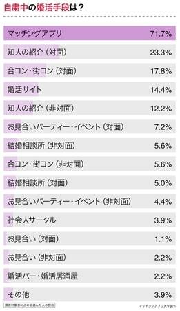 次に、自粛期間中に具体的にどのような手段で婚活したか尋ねたところ、もっとも多かったのは非対面婚活の代名詞ともいえる「マッチングアプリ」で71.7%となった。