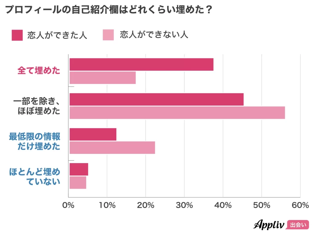 一方、恋人ができない人で「全て埋めた」は17%となっており、恋人ができた人の方が2倍以上高いことから、プロフィールの自己紹介欄を埋めることがマッチングの成功率に影響していると言えます。