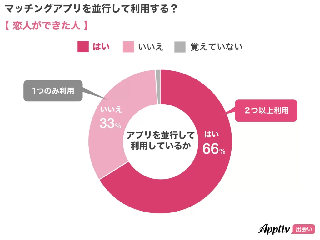 同時期に2つ以上のマッチングアプリを並行して利用したかをたずねたところ、恋人ができた人で2つ以上同時並行で利用していた割合が66%と、全体の7割近い結果になりました。