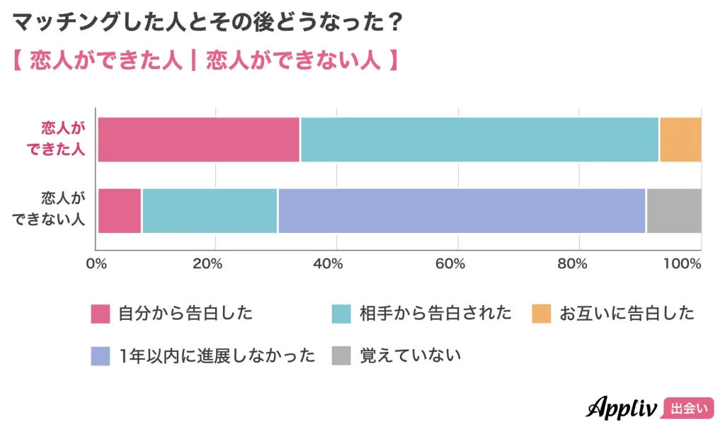 マッチングした相手とその後の関係について聞いたところ、恋人ができた人の方が自分から告白している割合が4倍以上高い結果に。また、恋人ができない人のうち約半数以上が、マッチングした相手と「1年以内に進展しなかった」と回答しています。