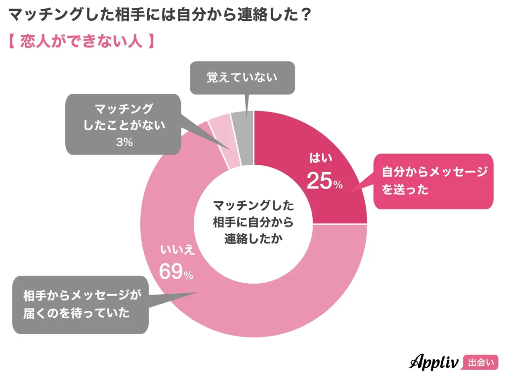 恋人ができない人の結果を見ると、自分からメッセージを送った人は25%で、恋人ができた人の方が2倍近く多いことから、マッチングアプリを利用して恋人を作るには、ある程度自分から積極的に行動したほうが良いと言えるでしょう。