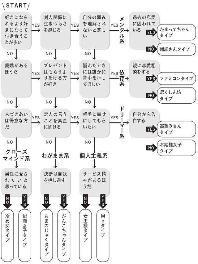 仲人の観点を可視化した書籍『恋愛マッチング方程式』では恋愛診断で女性を以下の12タイプチャートとして紹介している。