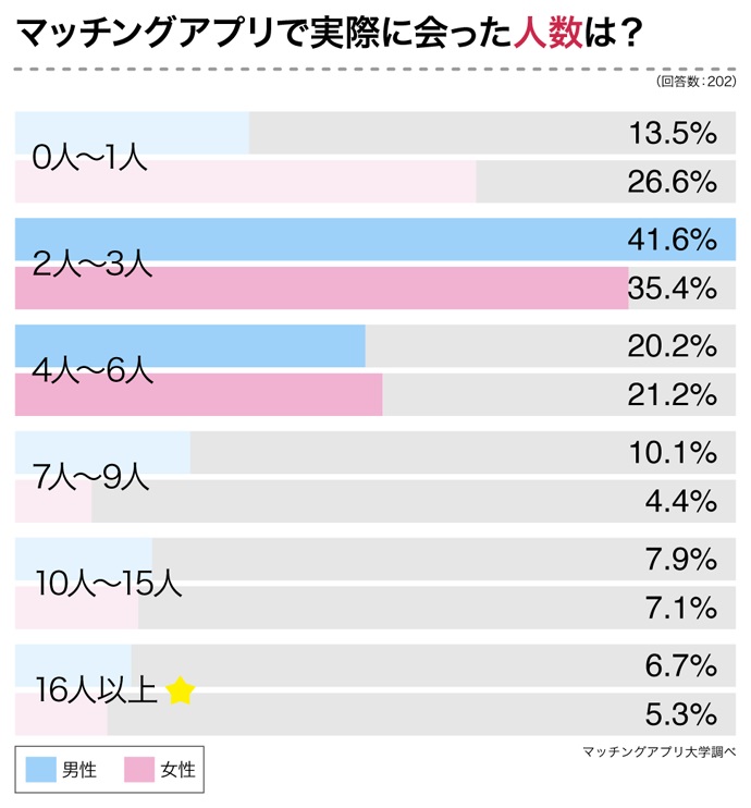マッチングアプリで実際に出会った人数を聞いたところ、「2~3人」と答えた人は男性41.6%、女性35.4%、「4~6人」と答えた人は男性20.2%、女性は21.2%だった。