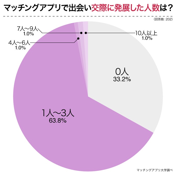 マッチングアプリでの出会いから交際に発展した人は併せて66.9%だった。人数別に見ると「1~3人」が全体の63.8%、「4~6人」「7~9人」「10人以上」が各1.0%だった。