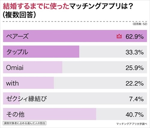 マッチングアプリを利用して結婚したと答えた男女に使用したアプリを聞いたところ、最も多かったのは「ペアーズ」(62.9%)、2位は「タップル」(33.3%)だった。