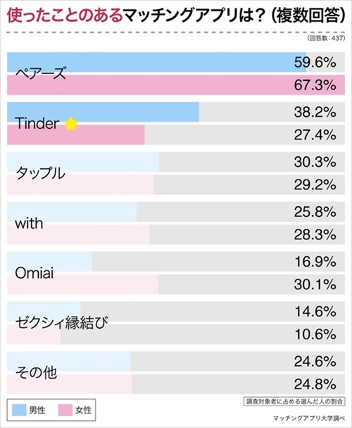 「使ったことのあるマッチングアプリ」の1位は「ペアーズ」(男性59.6%、女性67.3%)だった。「Tinder」は男性38.23%、女性27.4%と男女差があった。