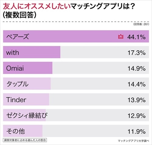 「友人にオススメしたいマッチングアプリ」の1位は「ペアーズ」(44.1%)、2位は「with」(17.3%)、3位は「Omiai」(14.9%)だった。