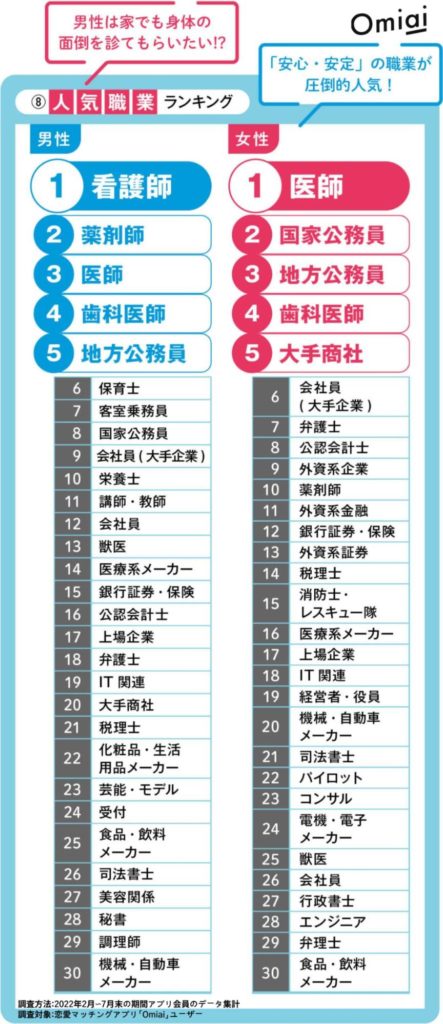 職業面で見てみると、現代は男女ともにパートナーに安定や収入を求める傾向にあると言えそうです。