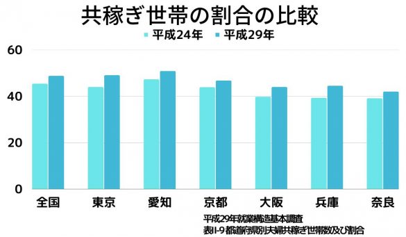 総務省統計局「平成29年就業構造基本調査」を見ると、夫婦共に有業の世帯は全国で48.8%、東京で49.9%。47都道府県のうち共稼ぎ率が最も低いのは奈良県の42.0%、次いで大阪府44.0%、兵庫県44.5%と、どれも近畿地方です。