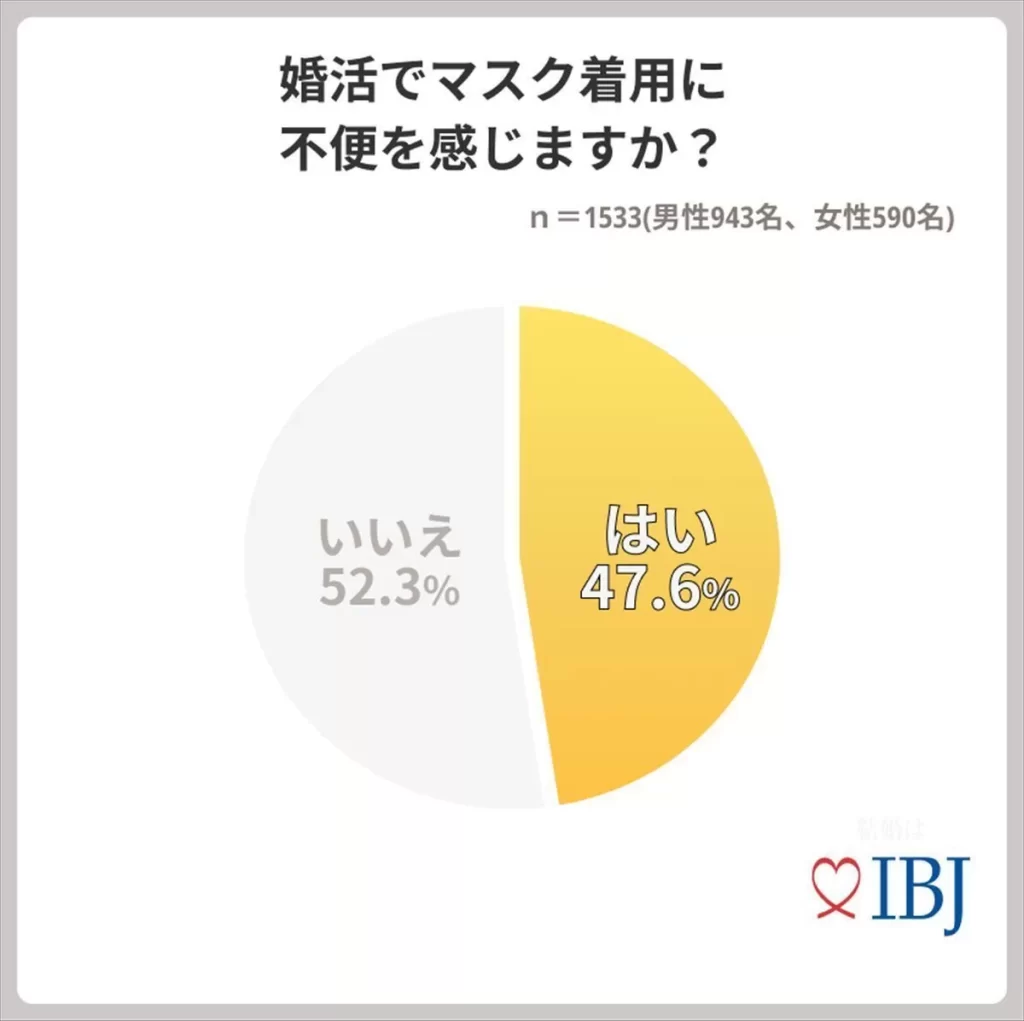 婚活でマスク着用を不便に感じたことがあるか尋ねたところ、「はい」は47.6%、「いいえ」は52.3%となった。