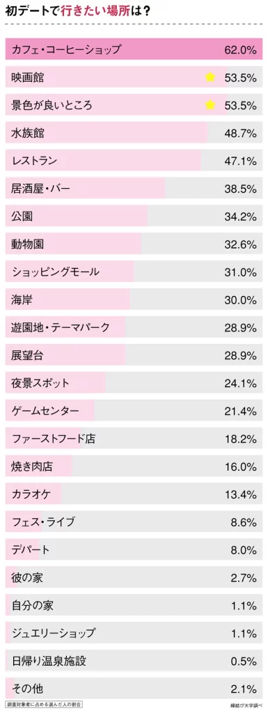 遊園地は11位と惜しくもベスト10入りしませんでした。やはり付き合う前の初デートで遊園地は、かなり気の合う相手でないと難しいかもしれませんね。