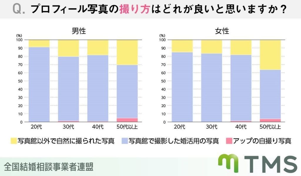 プロフィール写真の撮り方で良いと思うものを聞いたところ、年齢を重ねるごとに「写真館以外で自然に撮られた写真」を好む傾向も見られたが、圧倒的に「写真館で撮ってもらった婚活用の写真が良い」と回答した人が多く、20代で9割、30~40代で8割という結果に。枚数は、「渾身の1枚」(約4割)よりも「雰囲気の違う2枚」(約6割)を見ることを希望している人の方が多いよう。