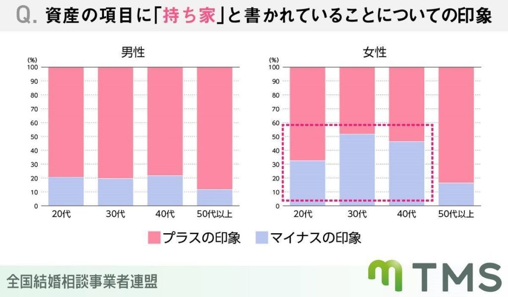また、資産の項目に「持ち家」と書かれていた場合には、男性8割が「プラスの印象」を持つと回答したが、女性は30~40代を中心に約半数が「マイナスの印象」を持つことが明らかに。女性は結婚後の住居が限定されるイメージをネガティブにとらえる方も一定数いることがわかった。