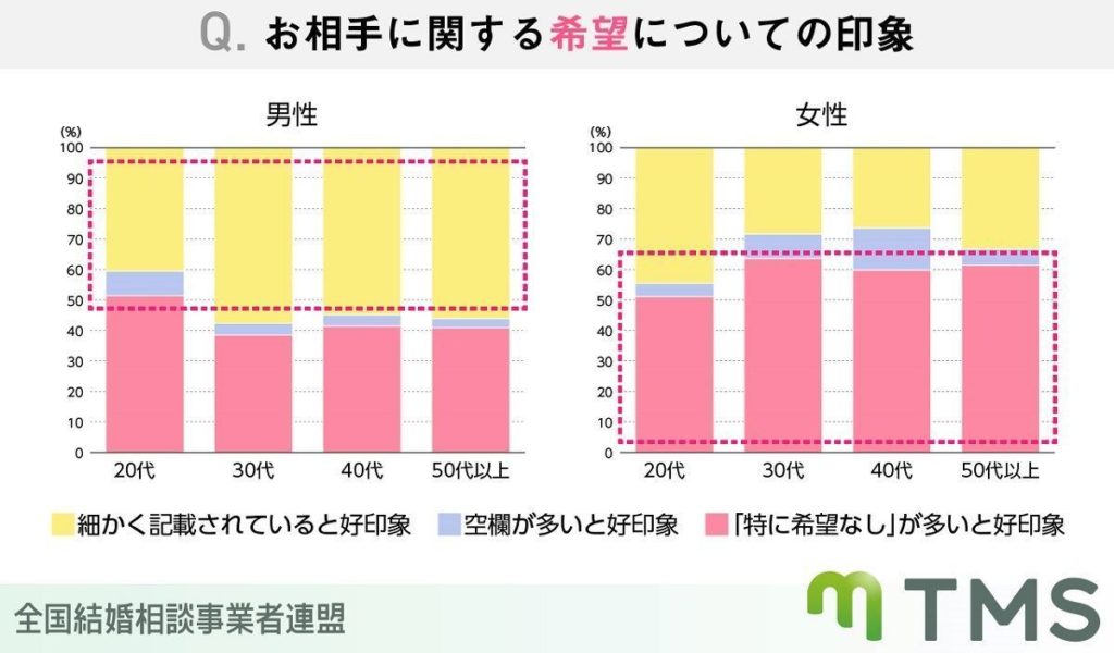 最後に、お相手希望の書き方について「細かく記載」「空欄が多い」「『特に希望なし』が多い」のどれがいいかと質問したところ、男性は「細かく記載」されていると好印象、女性は「特に希望なし」が多いと好印象、と男女で回答が分かれる結果となった。