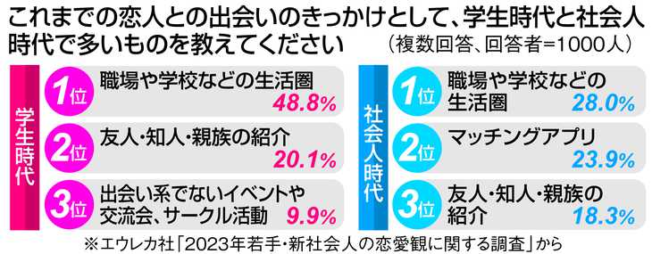 登録者約2千万人の「ペアーズ」を運営する「エウレカ」(東京都港区)が今年2月、入社10年目以内の男女千人に行った調査では、恋人との出会いのきっかけは「職場や学校などの生活圏」が28%と最多だったが、「マッチングアプリ」(23・9%)は2番目に多かったという。