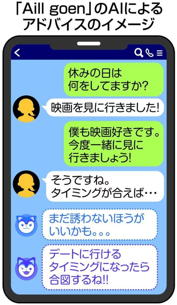 エールゴエンは登録者の中から進展が期待できそうな条件の人を人工知能(AI)が探し出し、紹介するのが特徴。当人同士のチャットでの会話から相手側の好感度をAIが可視化し、デートに誘うタイミングなどもアドバイスする。