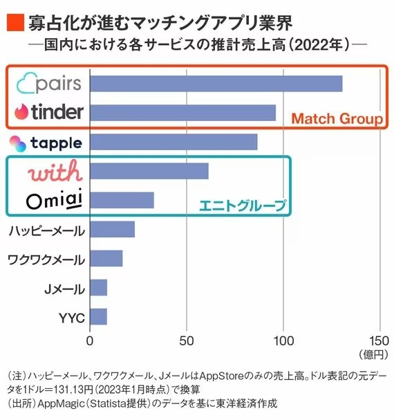 国内のマッチングアプリ業界では市場の成長とともに新規参入も相次いだが、現在は「3強」による実質的な寡占状態にある。ペアーズと業界2位の「ティンダー」を抱えるMatch Group、タップル、そしてwithとOmiaiを擁するエニトグループだ。