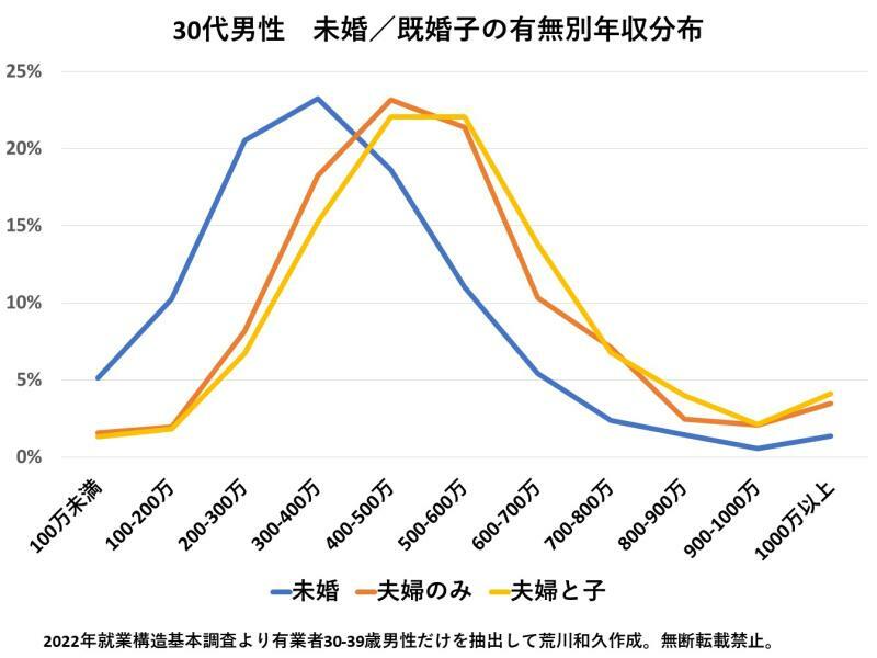 中央値でいえば、既婚男性(子無し)486万円に対し、未婚男性は361万円だ。その差は126万円もある。月にして約10万円の差である。子有りの既婚男性の中央値が513万円で、子有りと子無しの差はわずか26万円に過ぎない。